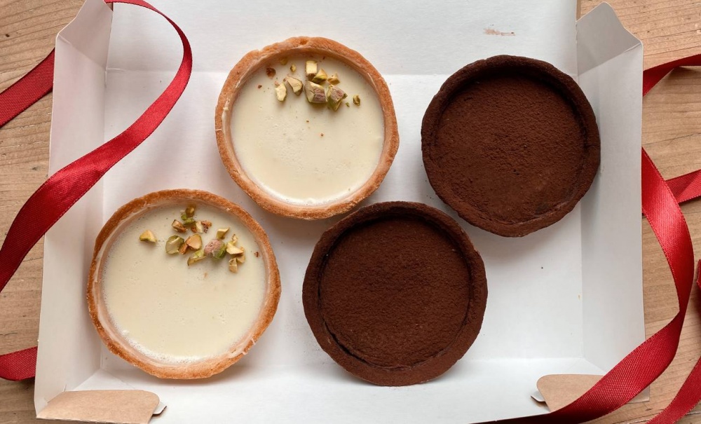 Состав: Мука, масло сливочное, яйца, какао, сахарная пудра, шоколад горький, шоколад белый, сыр дорблю, сыр бри, фисташка, соль