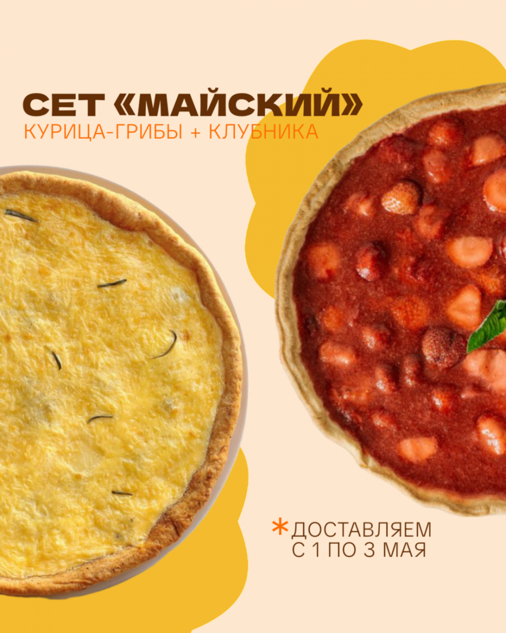 Состав: 1/2 пирога с курицей и грибами (пшеничная мука, сливочное масло, творог, сахар, соль, курица-филе, шампиньоны, сыр тильзитер, сливки, яйца, репчатый лук, розмарин, соль, мускатный орех), 600г; 1/2 пирога с клубникой и рикоттой (пшеничная мука, сливочное масло, клубника, рикотта, яйца, мята, сахар, соль, агар-агар), 500г